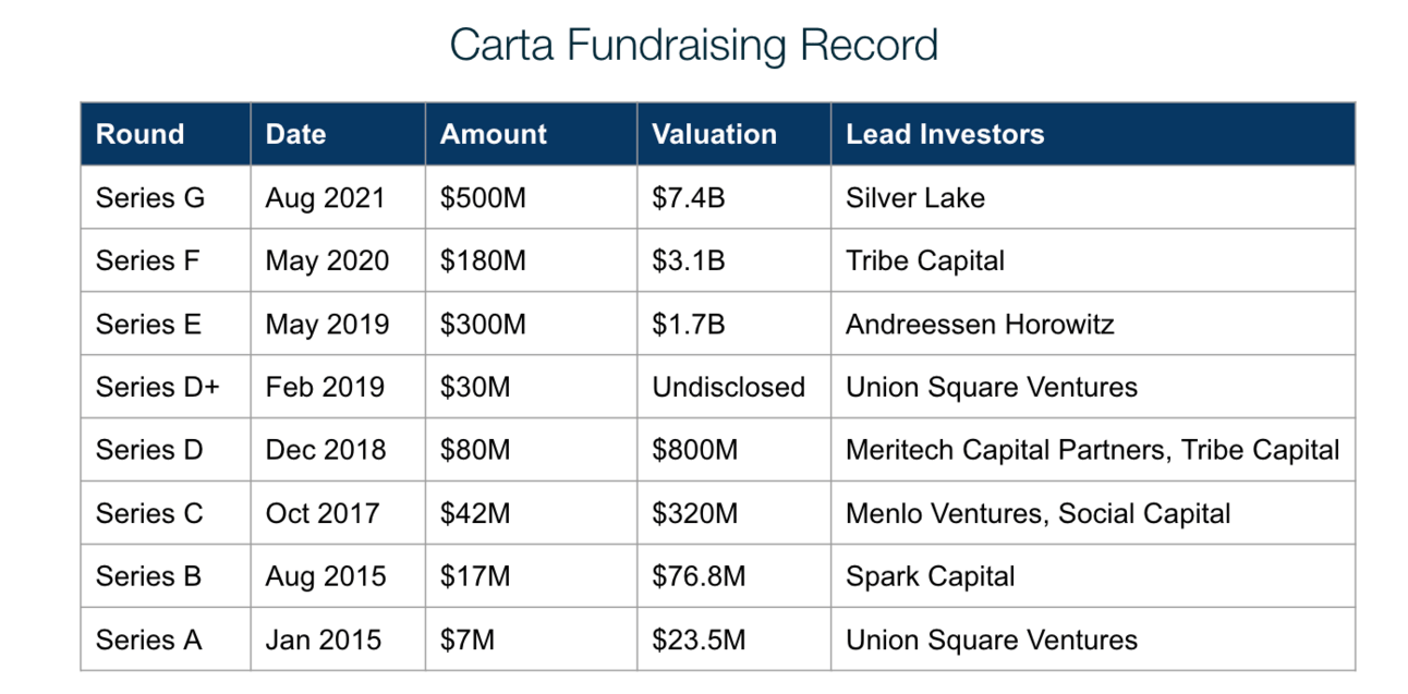 In August 2021, Carta successfully closed a $500 million Series G round led by Silver Lake, valuing the company at $7.4B. The round took place shortly after a secondary auction held by Carta, valuing the company at $6.9B. This marked a peak in their private market valuation, reflecting the buoyant investment climate of that period.