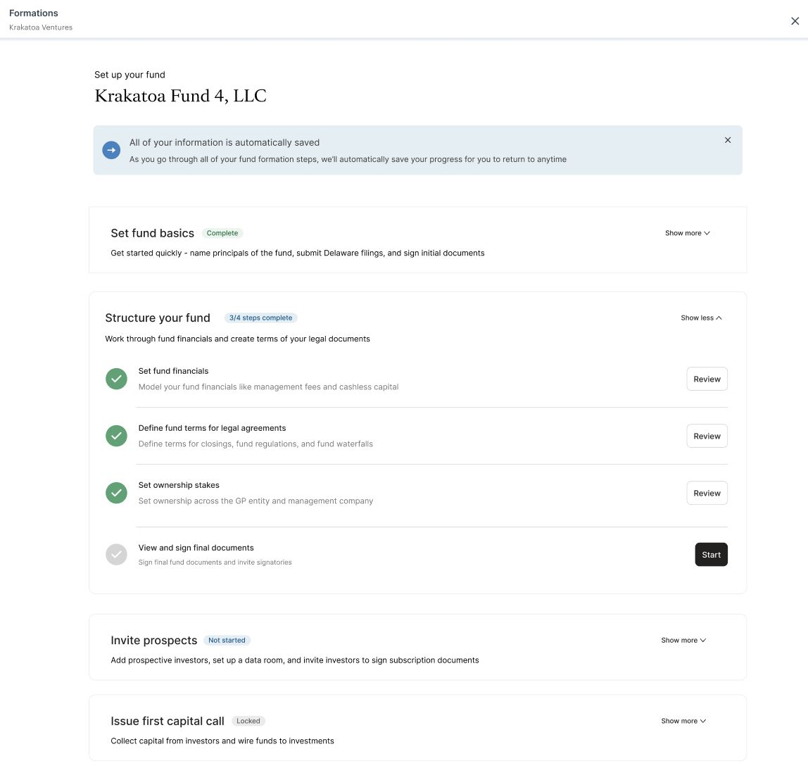 Carta streamlines the process of establishing a fund's legal entity, from defining terms and planning capital calls to signing formation contracts and closing with LPs, typically within six weeks. Currently, Carta supports four fund types, as follows: