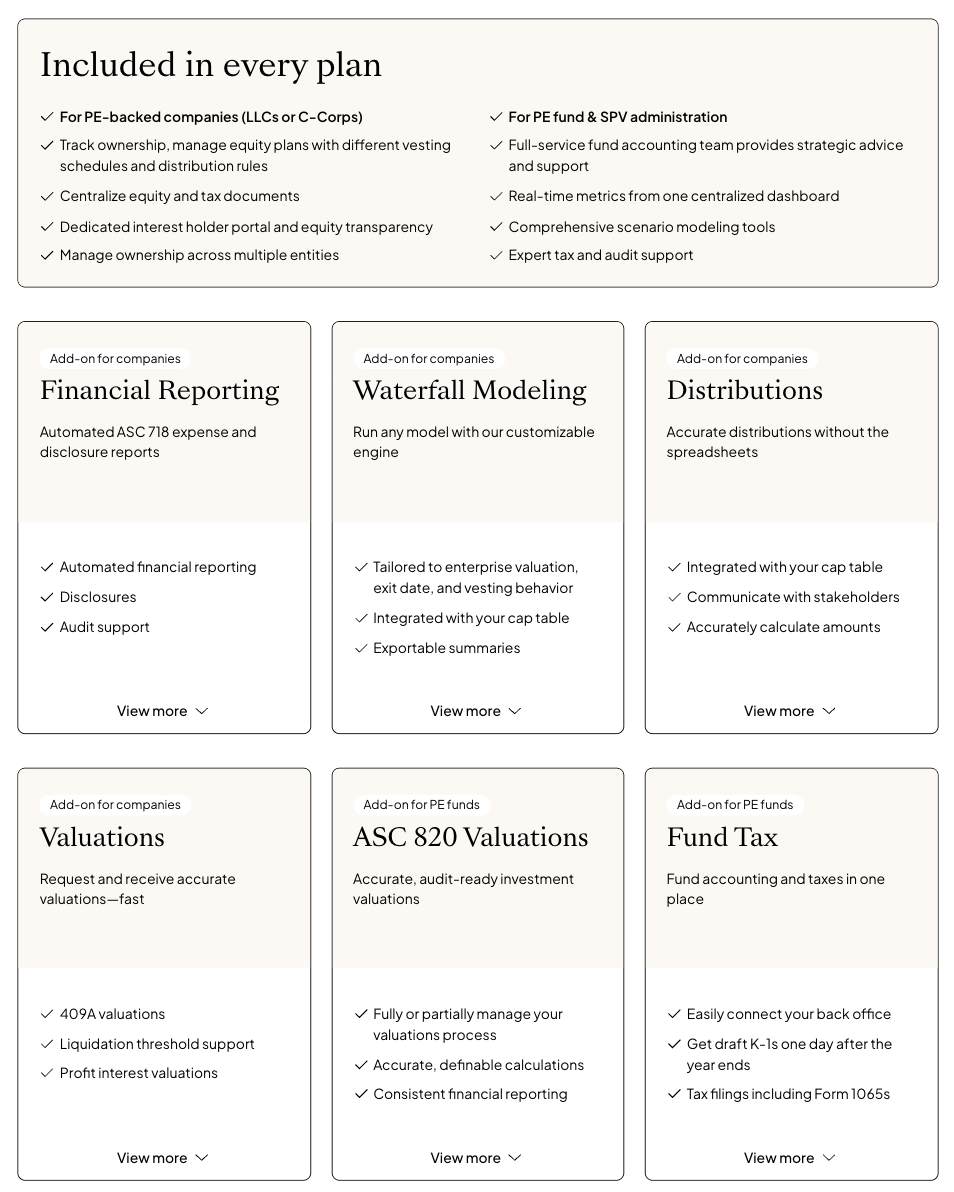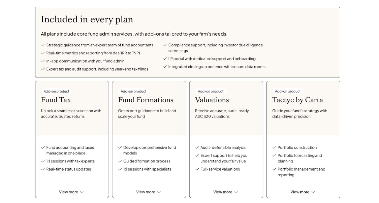 There is a single subscription plan for fund administration services, which covers the performance analytics, LP communications, tax and audit support for fund managers to manage their portfolios. Additional add-ons include Fund Tax, Fund Formations, Valuations and Tactyc (Portfolio Analytics).