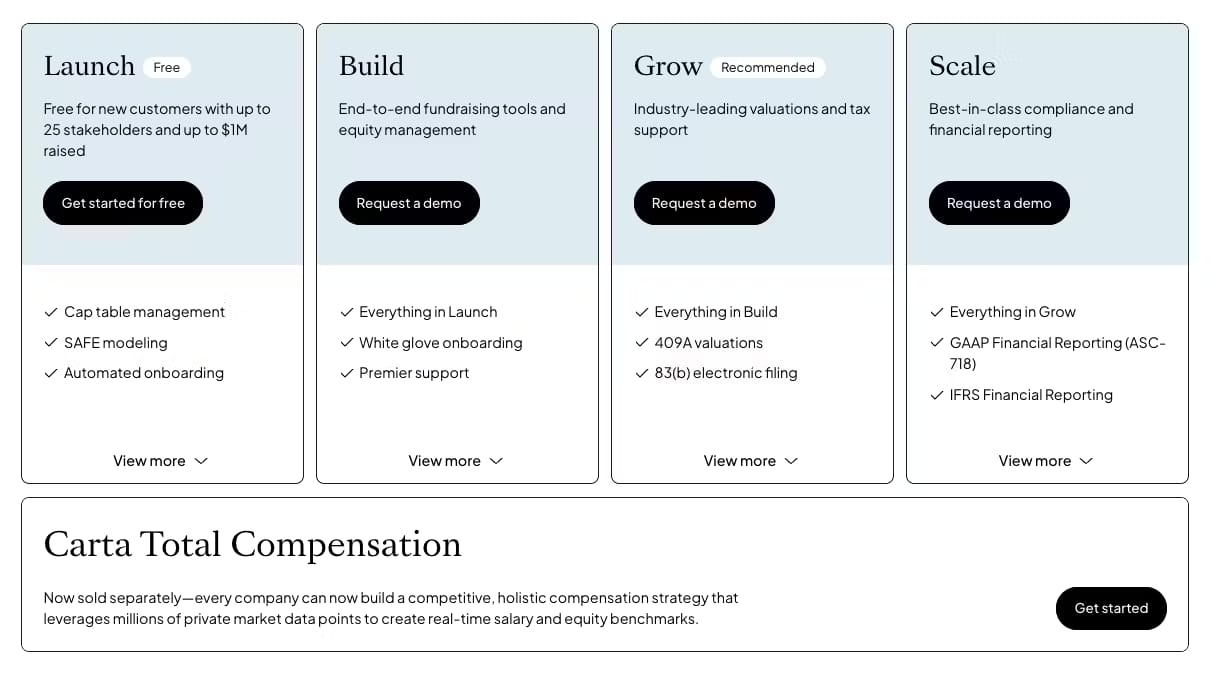 Carta offers four tiers of plans for private company equity management: Launch, Build, Grow, and Scale. The free tier, “Launch,” provides cap table management for smaller, newer startups. Each upgraded tier unlocks additional features, such as 409A valuations, exit modelling, and expense reporting. Customers can separately add liquidity programs, complex 409As, and advanced modelling to their plans.