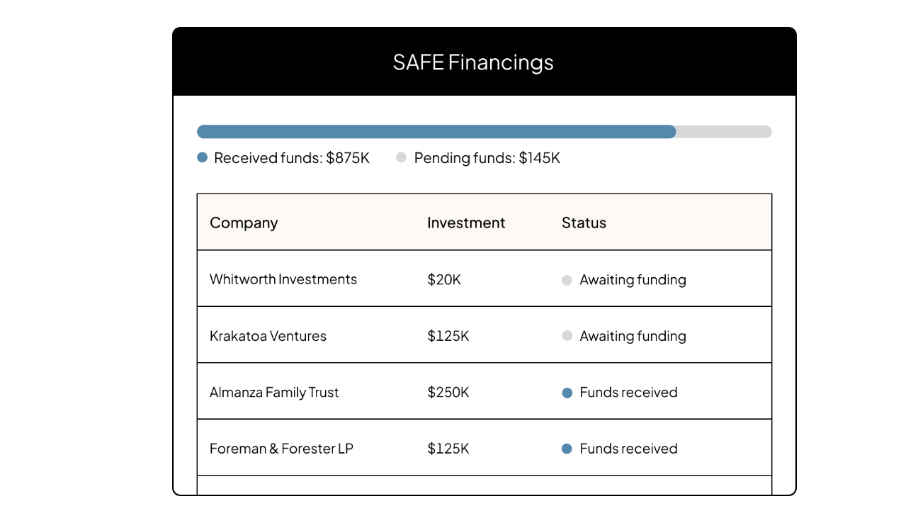 Facilitate the end-to-end process for Simple Agreement for Future Equity (SAFE) agreements, from contract creation to signature collection to funding distribution. Carta will connect and coordinate with investors and manage the transfer of funds.