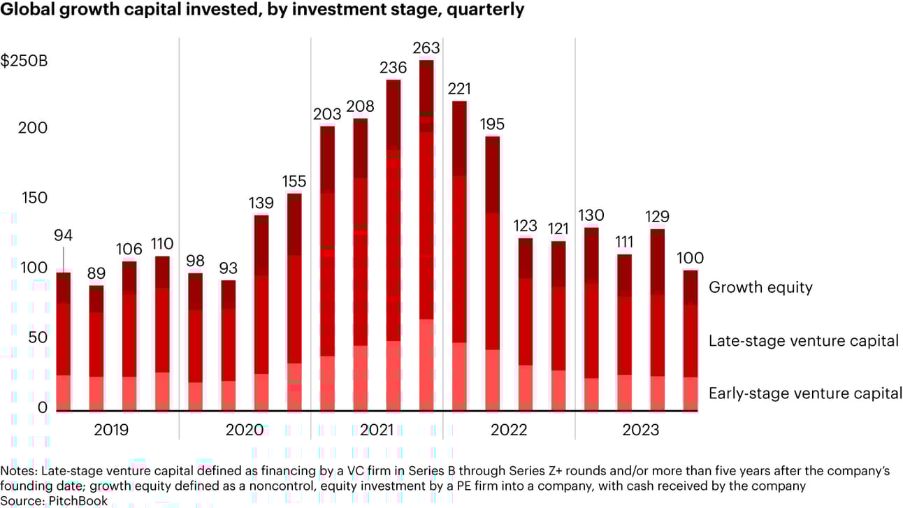 According to Bain & Company, investment activities in venture capital and growth equity have fallen to $100-120B per quarter, with both the growth and venture capital segments continuing to drift sideways. Both focus on riskier, earlier-stage companies whose growth-based valuations are particularly vulnerable to interest rate pressure.