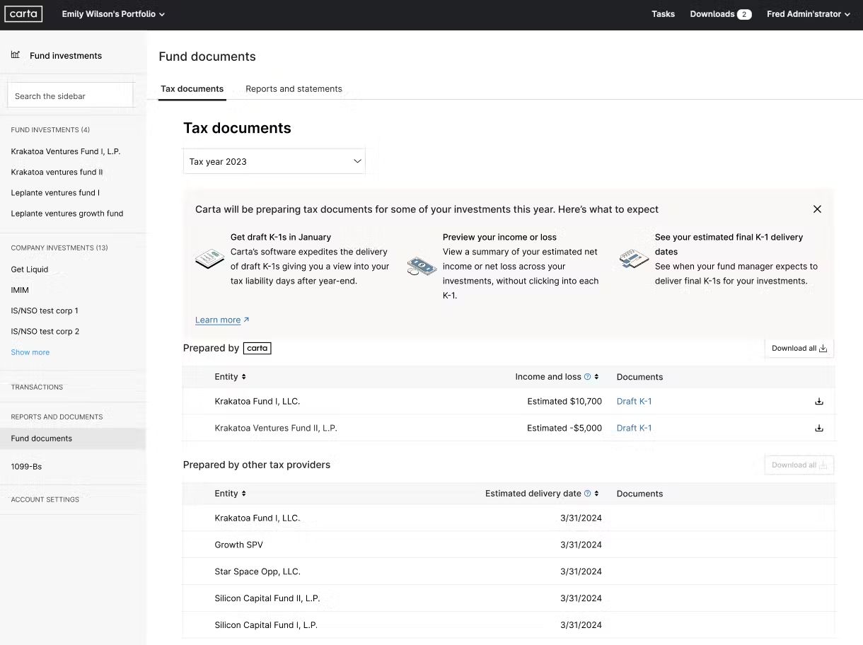 Carta provides an integrated tax preparation and filing service, centralizing your fund's accounting and tax management for clear visibility. Work directly with Carta’s in-house tax teams to efficiently prepare Form 1065s and K-1s, ensuring compliance with tax obligations and optimizing potential tax savings.