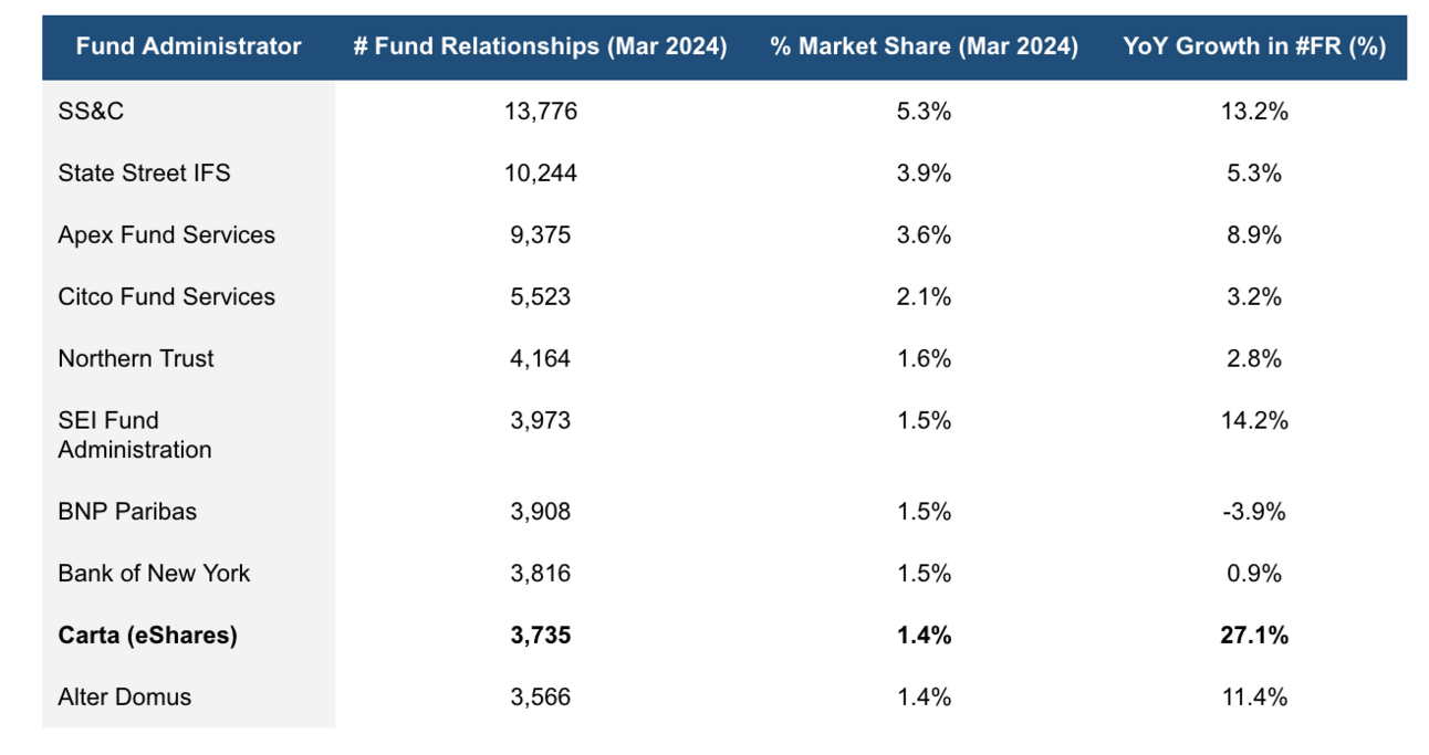 While Carta's penetration in startup cap table management is profound, its footprint in the broader fund administration market presents a different picture. Carta (Eshares) ranked 9th in March 2024 among fund administrators by fund relationships, holding a 1.4% market share with 3,735 fund relationships, behind incumbents such as State Street, SS&C, and Apex Fund Services. This is because fund administration is an established market servicing capital managers beyond venture funds, including private equity and multi-asset managers.
