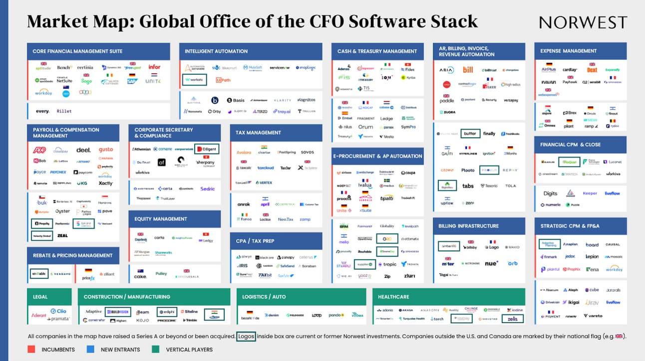 The competitive landscape for CFO software stack is highly fragmented, with many tools covering many capabilities from billing to procurement to tax to compliance to treasury to pricing to expense to financial planning & analysis (FP&A). However, there is a different story for funds; many of these processes are still being performed manually with spreadsheets, leaving white-space for fund administration providers.