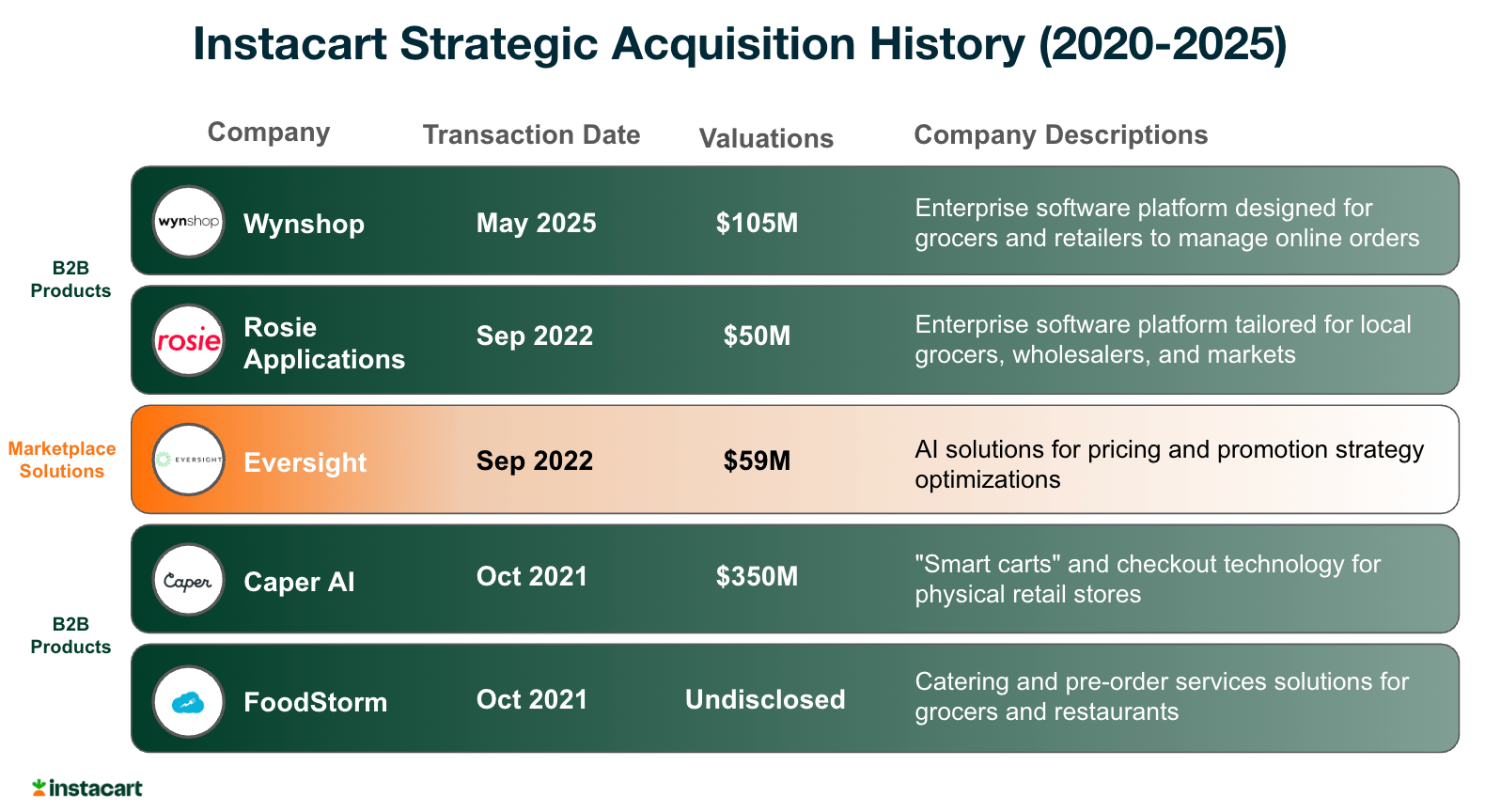 Over the past five years, Instacart has made a series of strategic acquisitions, with four directly related to enterprise solutions for grocers, ranging from in-store fulfillment to checkout and catering solutions.