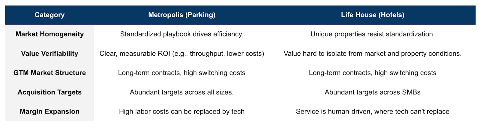 Heterogeneous Markets: The hospitality market is highly heterogeneous, with a strong emphasis on marketing and occupancy performance rather than purely on cost and operational management. The value of hotel software is harder to verify and attribute than a parking solution